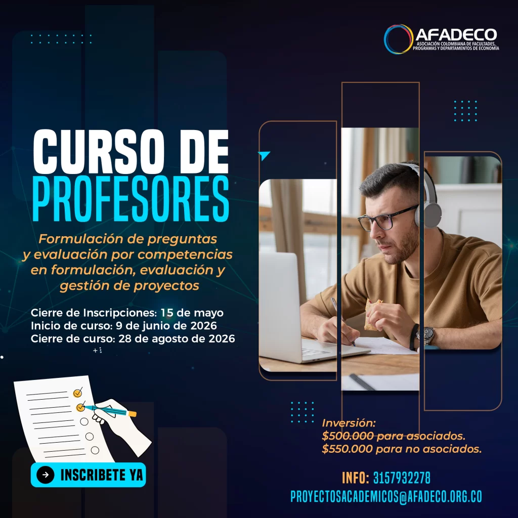 La Asociación Colombiana de Facultades, Programas y Departamentos de Economía AFADECO se complace en invitar a la comunidad académica a participar en el Curso de Formulación de Preguntas y Evaluación de competencias, utilizando el modelo basado en evidencias, un espacio de formación orientado al fortalecimiento de capacidades en la construcción de ítems de evaluación bajo el enfoque por competencias para el módulo de formulación, evaluación y gestión de proyectos, conforme a metodologías aplicadas en pruebas estandarizadas.