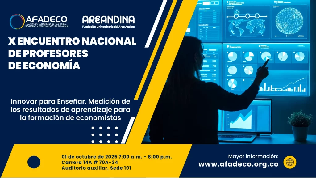 Desde la Asociación Colombiana de Facultades, Programas y Departamentos de Economía – AFADECO, en asocio del programa de economía de Fundación Universitaria del Área Andina, se ha pensado un espacio en el cual sus Asociados a nivel nacional, puedan compartir sus experiencias sobre: Innovar para Enseñar – Medición de los resultados de aprendizaje para la formación de economistas. Taller reflexivo para entender cómo los resultados de aprendizaje dan respuesta a la formación de futuros economistas que impacten de manera productiva en las necesidades del mercado.